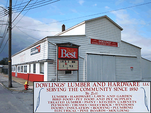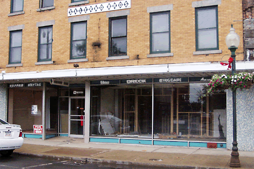 Main Street, Oneida The Big Boxes are about three miles from downtown, a blighted area with many vacant storefronts. Efforts to attract new retail businesses have been unsuccessful. Attention has now turned to trying to attract other services. One of the largest vacant properties downtown is the former Dowlings' Lumber and Hardware (left). Dowlings' Served Oneida for over 150 years from 1850 to 2006, before finally succumbing to the Big Box competition and closing just prior to the opening of Lowe's. A large empty storefront on Main Street houses the former home of Salerno Brothers appliance store (right). The store which had been in business since 1927 closed recently.